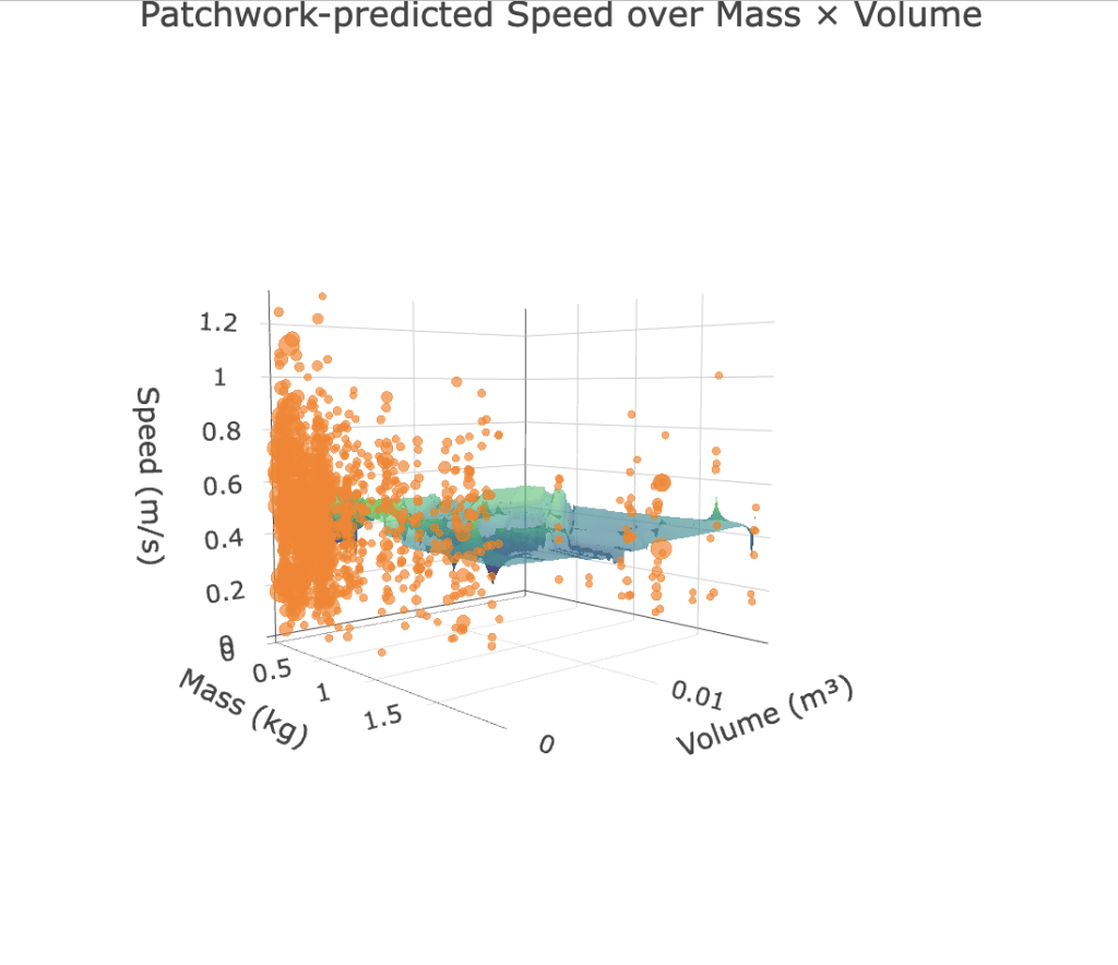 These image-computable features become coordinates in a Patchwork model: each interaction is a point in a multivariate space defined by object size, volume, speed, contact duration, and other behaviorally relevant dimensions. By comparing human judgments to predictions from this image-computable Patchwork, I can test how well real-world physical statistics captured from video explain intuitive physics.